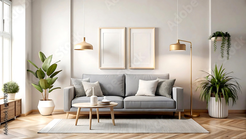 Home interior with gray sofa and white wall mock up, Scandinavian style, 3d render, white Mock up frame