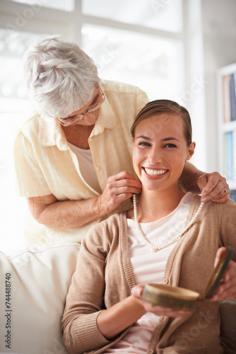 Home, necklace and portrait of senior mother and woman for present, gift and surprise in living room. Family, happy and daughter with mom giving pearls on sofa for celebration, birthday and bonding