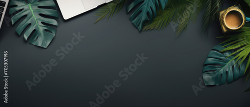 Home Office Concept with Monstera Leaves, Laptop, and a Cup of Coffee on a Dark Table