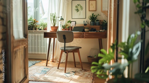 Home Office with Minimalist Design: Wooden Desk, Decorative Items, Chair, and Potted Plants. A Doorway Opens to a Cozy Adjacent Room. Home Decor