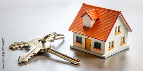 Home Ownership, Real Estate Keys & House Model, White Background Stock Photo