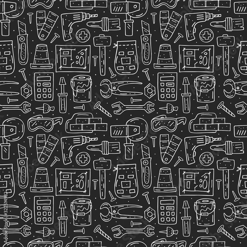 Home repair tools, instruments cartoon cute hand drawn doodle vector seamless pattern, texture, backdrop. Funny monochrome design on dark background. Building decorative design elements. Packaging.