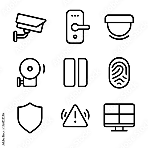 Home Security Icons. Outline icon set of home security monitoring: security camera, door lock, motion detector, alarm bell, window