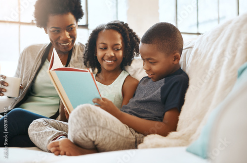 Home, storytelling and mother with kids, reading book and happiness with knowledge, learning or bonding together. Apartment, single parent on couch and mama with children or literature in living room
