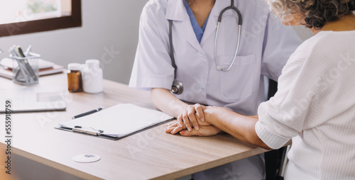 Homecare nursing service and elderly people cardiology healthcare. Close up of young hispanic female doctor nurse check mature caucasian man patient heartbeat using stethoscope during visit