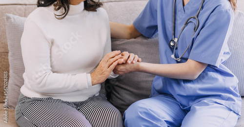 Homecare nursing service and elderly people cardiology healthcare. Close up of young hispanic female doctor nurse check mature caucasian man patient heartbeat using stethoscope during visit