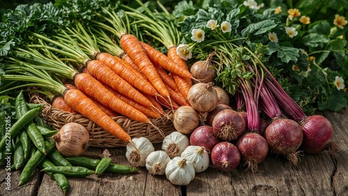 Homegrown organic summer harvest featuring carrots, peas, kohlrabi, onions, garlic, and beetroot for roasting