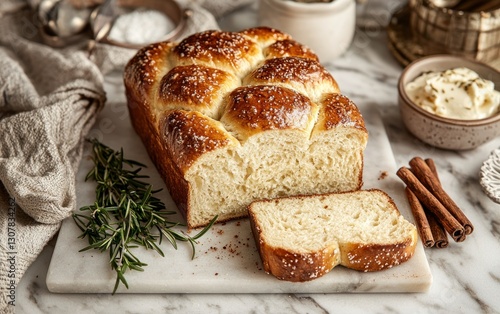 Homemade artisan sourdough bread loaf, sliced, on marble board with rosemary and cinnamon.
