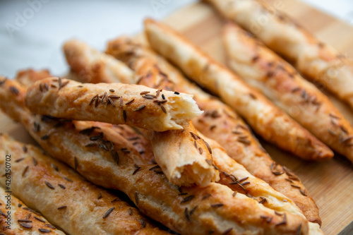 Homemade baked grissini sticks sprinkled with caraway seeds