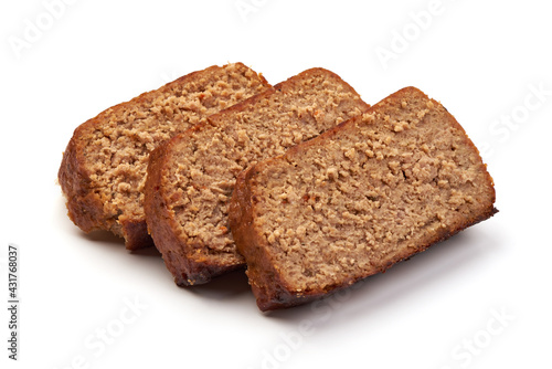 Homemade baked turkey meatloaf, isolated on white background