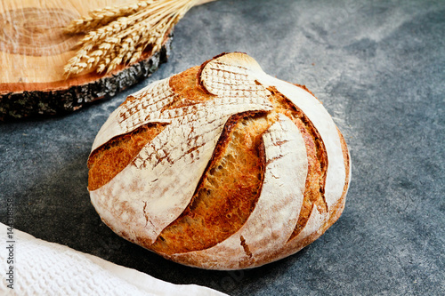 Homemade beautiful loaf of bread and ears of wheat on grey background. Selective focus and space for text