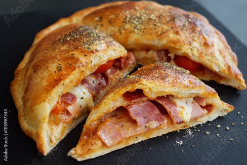 Homemade calzone with ham sliced and topped with tomatoes bacon and cheese on a black board