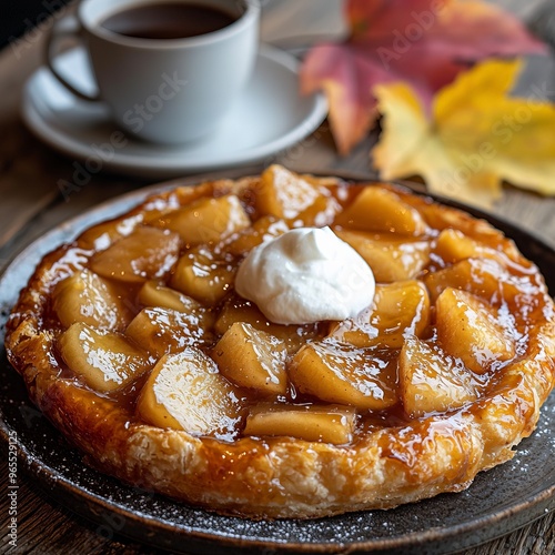 Homemade caramelized apple tart topped with whipped cream, served with coffee in a cozy autumn setting