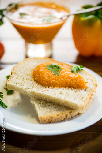 Homemade caviar of vegetables on a slice of bread