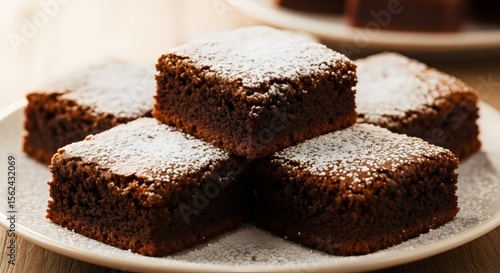 Homemade chocolate brownies dusted with powdered sugar on a plate