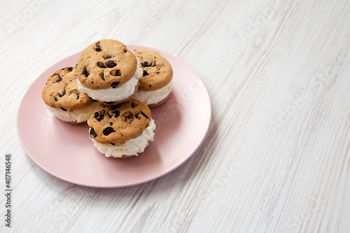 Homemade Chocolate Chip Cookie Ice Cream Sandwich on a pink plate on a white wooden background, side view. Space for text.