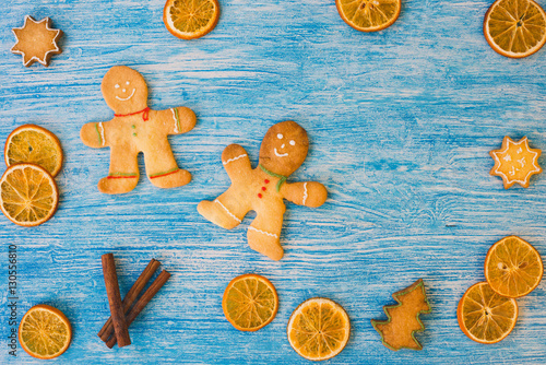 Homemade christamas cookies with festive decorations. Gingerbread men on blue wooden backgound.