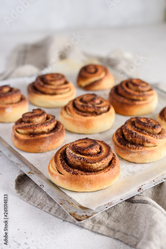Homemade cinnamon buns on a baking sheet. Delicious cinnamon rolls