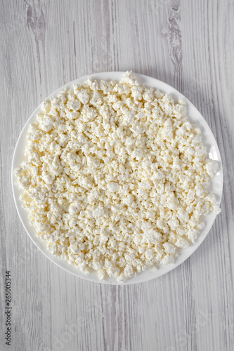 Homemade cottage cheese on a white plate, overhead view. From above, top view.
