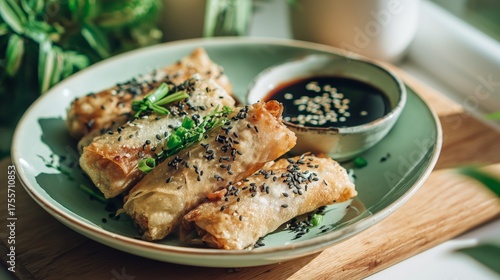homemade crispy rice paper rolls with soy dip on light green ceramic plate