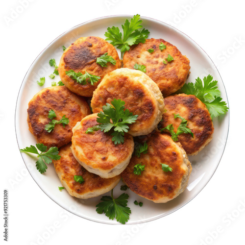 Homemade cutlets on white plate top view isolated on transparent background