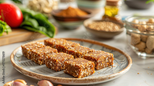 Homemade energy bars with dried fruits and nuts on a ceramic plate, surrounded by healthy ingredients