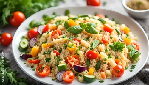 Homemade Fresh Couscous salad with vegetables, in white plate.