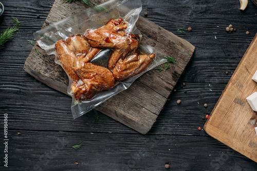 homemade hot-smoked chicken wings, in vacuum packaging on an old wooden board next to vegetables and spices