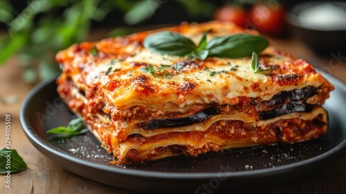 Homemade lasagna with meat sauce, eggplant, and basil on a dark plate
