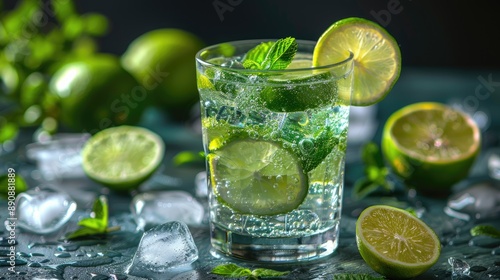 Homemade lemonade or mojito cocktail with lime, mint, and ice cubes in a glass on a light stone table. Fresh summer drink with copy space