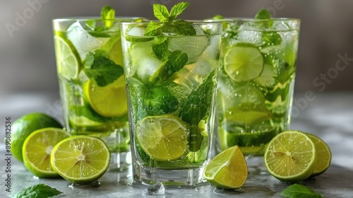Homemade lemonade or mojito cocktail with lime, mint, and ice cubes in a glass on a light stone table. Fresh summer drink with copy space