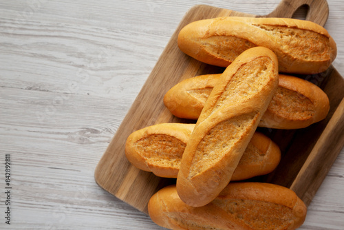 Homemade Mini baguettes on a wooden board, top view. Flat lay, overhead, from above. Copy space.