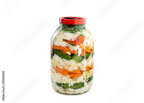 Homemade Mixed Pickles Inside A Jar, Isolated On White Surface
