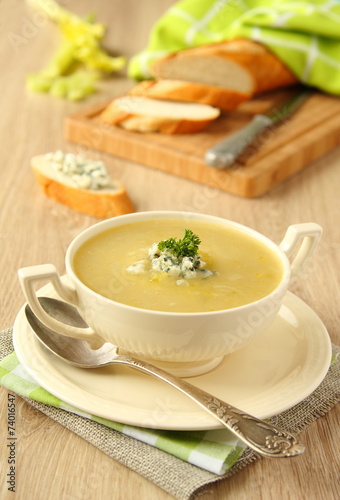 Homemade onion soup with celery and blue cheese