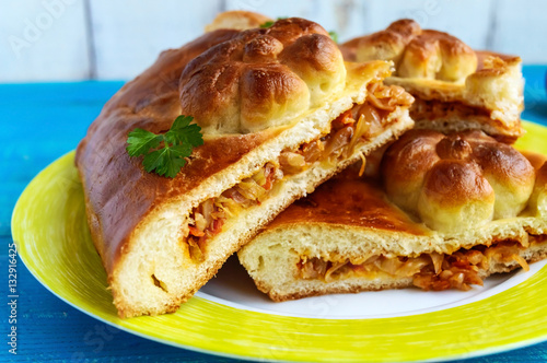 Homemade pie with cabbage chopped pieces on a blue background. Close up