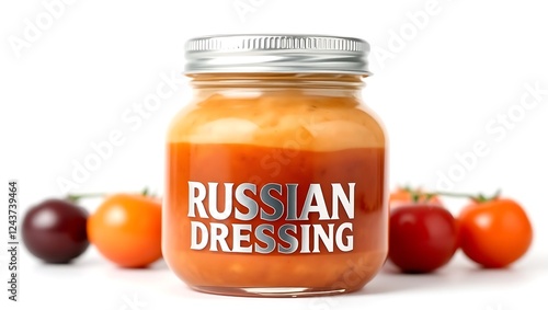 Homemade Russian dressing in a jar with fresh tomatoes on display