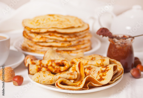 homemade russian thin tasty pancakes on the plate with chocolate cream sauce.