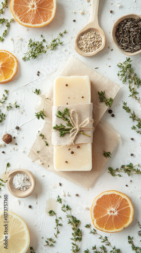 Homemade soap wrapped in eco-friendly paper with natural ingredients displayed alongside citrus fruits and herbs