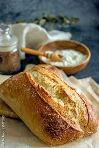 Homemade sourdough bread on a dark table with a napkin, next to flour. Loaf of freshly baked bread close up, vertical background