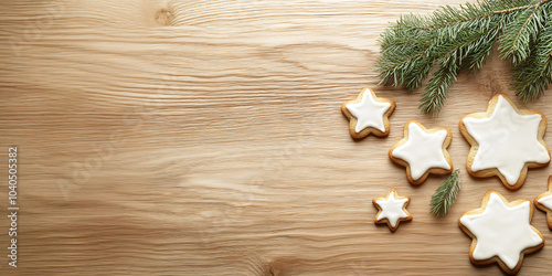 Homemade star-shaped cookies on wooden table background. Banner template for Christmas, New Year, bakery and holiday treats advertisements with space for text