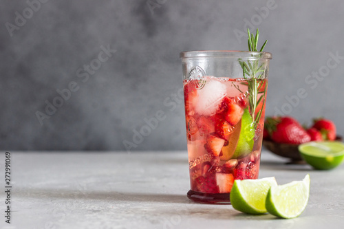 Homemade strawberry lemonade in glass with fresh strawberries, rosemary, pomegranate and lime over light grey stone table. Refreshing summer drink. Cocktail bar background concept. Copy space.