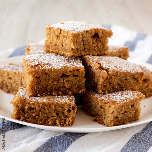 Homemade Tasty Applesauce Cake on a white plate, side view. Close-up.