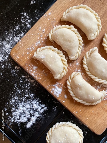 Homemade varenyky on a wooden board over a black baking tray, lightly dusted with flour — appetizing traditional top-view shot.