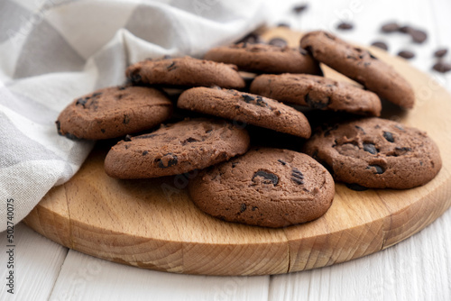 Homemade vegan cookies of cereal on wooden board with kitchen towel. Recipe of sugar free cookies with raisins and nuts, vegan diet snack. Snack or treat for tea or coffee.