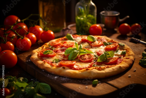Homemade vegetarian pizza with fresh tomatoes and basil, healthy lifestyle