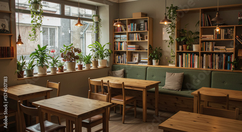 Homey Cafe Interior with Couch, Books, and Potted Plants