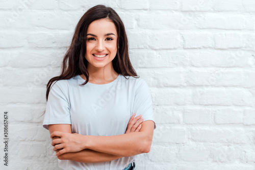 Honestly smiling girl, arms crossed, poses against a brick, white wall background