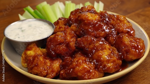 Honey BBQ Wings. Plate of Boneless Chicken Wings in Honey Garlic BBQ Sauce with a Side of Ranch and Celery. Delicious Barbecue Food
