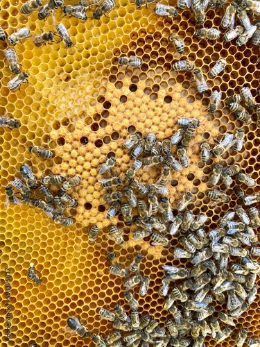 Honey Bees on a frame of wax in a beehive. Eggs and young larvae visible, with sealed brood.