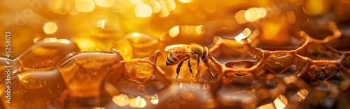 Honey bees sitting on honeycomb, closeup macro shot. beekeeping conception